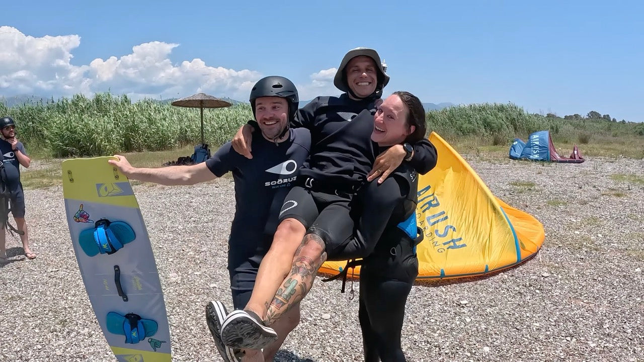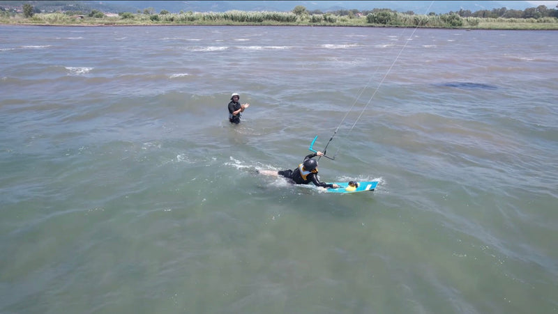 See in the video below real beginners learning exactly where you’ll learn: in flat, warm, waist-deep water in Nafpaktos, Greece. Watch first-timers practise kite control, body drags and their first waterstarts — all in the easiest beginner conditions in Greece.