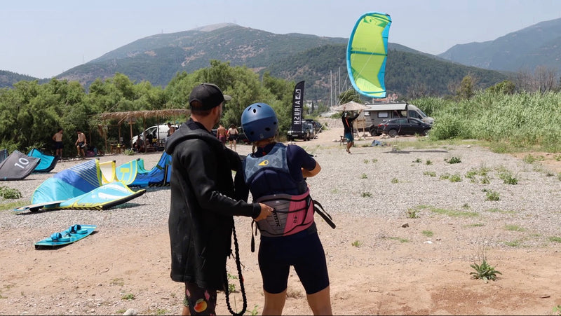 Every beginner kitesurfing lesson in Nafpaktos starts with the beach briefing, where you gear up and learn the essentials: safety basics, wind awareness, the wind window and how your safety systems work and how to communicate in the water.